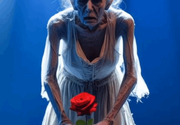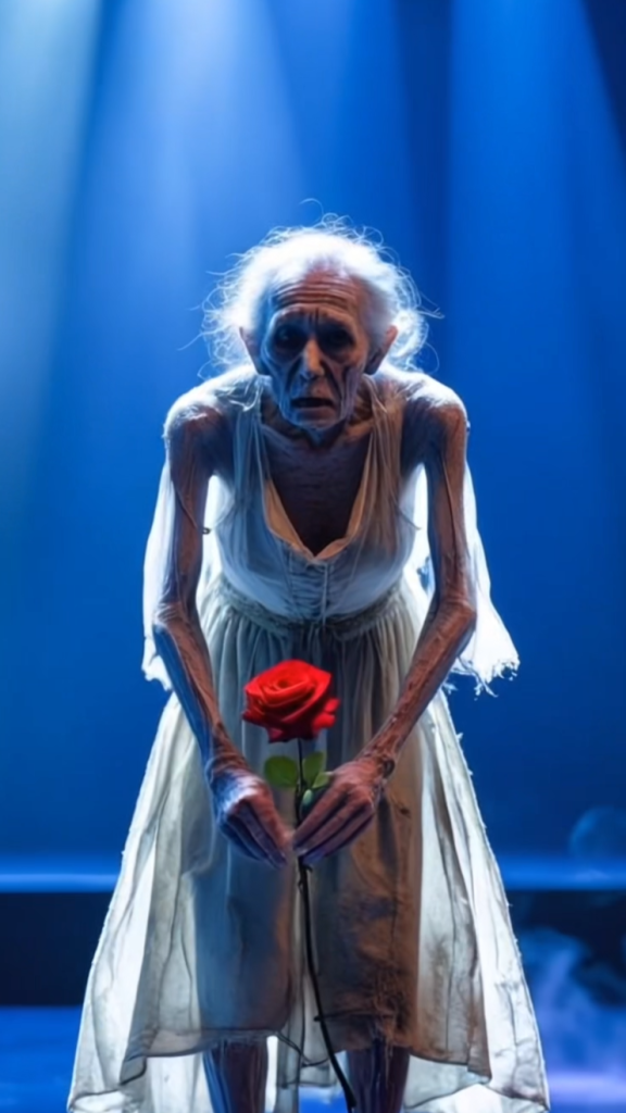 The stage was softly lit, a warm glow casting shadows across the wooden floor. In the silence, an old woman slowly stepped into the light. Hunched by the weight of time, wrapped in a dark cloak that dragged behind her, she held a single red flower—the only splash of color in the entire muted scene.