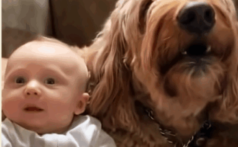 Talking Labradoodle says “I love you” to human baby brother Read More