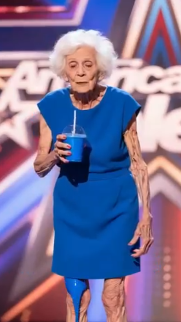 In her hand, she carries a small glass filled with a glowing blue liquid.The audience watches in silence. No one knows what to expect.Without a word, she lifts the glass… and drinks.
