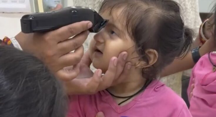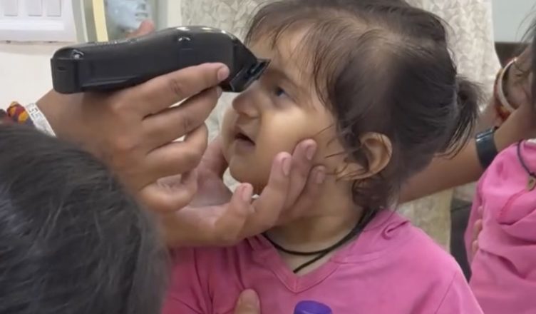 Her parents decided it was time. Whether it was for tradition, belief, or simply a fresh start, the clippers came out and the gentle hum filled the room. She sat there, calm and curious, not fully aware of the transformation about to happen.