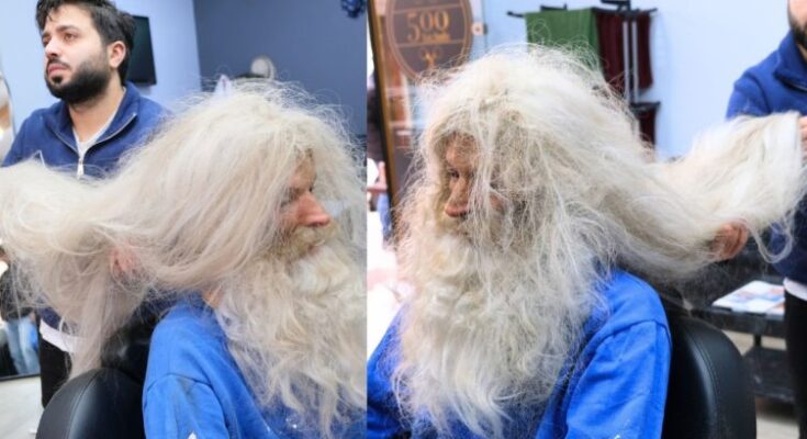 The footage follows a volunteer barber or stylist as they work with care and precision to clean, cut, and style the man’s extremely long, unkempt hair—likely untouched for years.