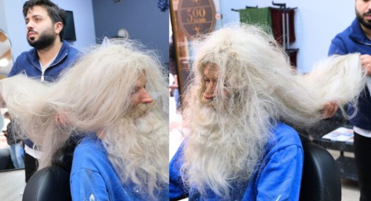 The footage follows a volunteer barber or stylist as they work with care and precision to clean, cut, and style the man’s extremely long, unkempt hair—likely untouched for years.