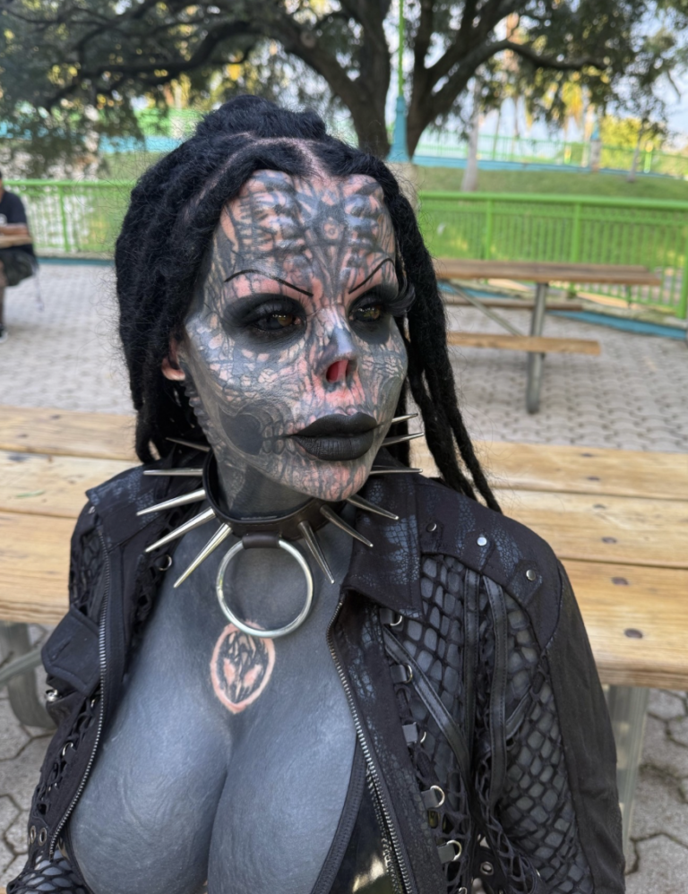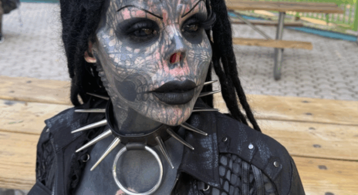 She’s had her nose removed, her eyes and tongue tattooed, horn-like implants placed in her forehead, and her tongue cut in half.